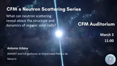 Organic solar cells, in which a donor and an acceptor mixture creates the so-called “bulk-heterojunction” (BHJ) optoelectronic active layer, are very promising devices for sustainable photovoltaics [1]. This active layer is mainly fabricated with a conjugated polymer (acting as donor) and small molecules or nanoparticles (acting as acceptors). Poly-[3-hexylthiophene] (P3HT) has been the benchmark donor in bulk-heterojunction organic solar cells (OSCs), and new derivatives of poly-thiophenes have driven a large interest in new approaches for polymeric solar cells with non-fullerene acceptors, for example P5TCN-Fx with cyano-group substitutions and varied fluorination degrees delivered high efficient OSCs [2], and more recently a 20% power conversion efficiency was achieved in polymeric OSCs in which a dual fibrillar molecular structure with a thiophene terminated non-fullerene acceptor, L8-ThCl, was used to induce the fibrillization of both polymer donor and host acceptor polymers [3]. The interplay between structure and dynamics of the materials (at nanometer spatial interpenetration scale, and picosecond time scale) is critical to understand the photocurrent generation mechanism. In this seminar, I will present the results obtained by characterization of conjugated polymers by: i) small angle neutron scattering, which shows an interesting reversible gelification process demonstrating that the fibrillar structure is triggered in solution, ii) quasielastic neutron scattering that explores the temperature dependence of the dynamics of P3HT at several time scales [4], and iii) the vertical composition reorganization upon annealing of the active layer explored by neutron reflectometry [5].